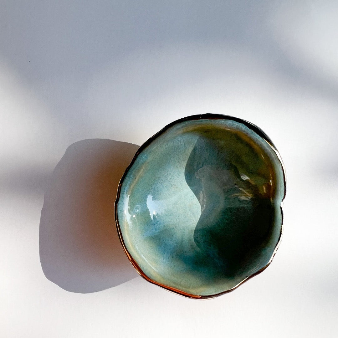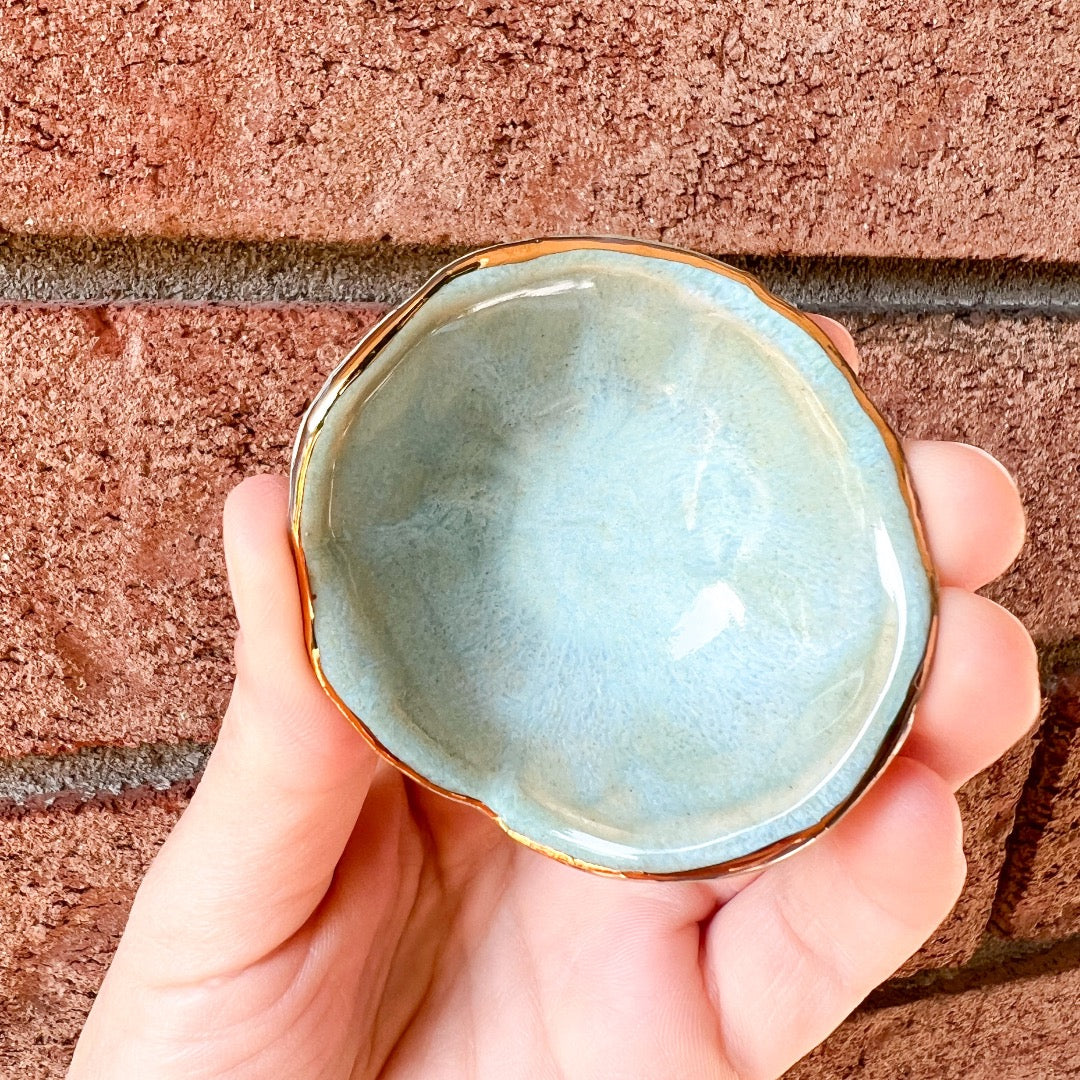 Cute little handmade bowl that can be used throughout your home for rings and earrings.  This hand built ceramic dish is approximately 1" tall and 2" wide, with a turquoise interior and gold lustre on the rim.  Each piece is made by hand; therefore, sizes and colours may vary slightly.