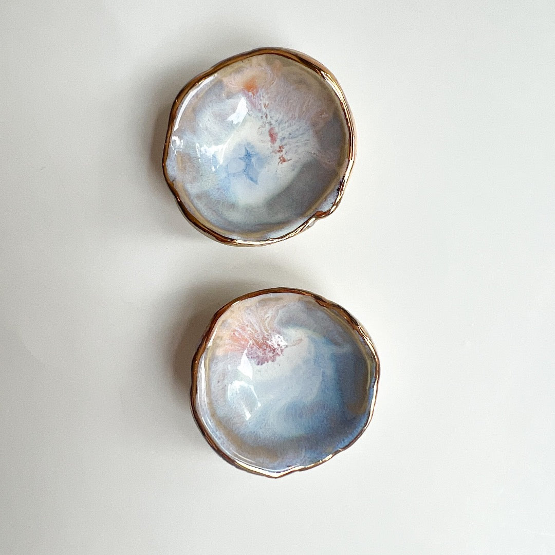 Cute little handmade bowl that can be used throughout your home for rings and earrings. This hand built ceramic dish is approximately 1" tall and 2" wide, with a turquoise interior and gold lustre on the rim. Each piece is made by hand; therefore, sizes and colours may vary slightly.