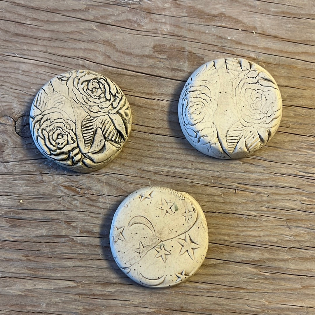 A flat trinket dish that can be used for jewellery. This hand built ceramic dish is approximately 2” in diameter, gold lustre around the rim. Each piece is made by hand; therefore, sizes and colours may vary slightly.