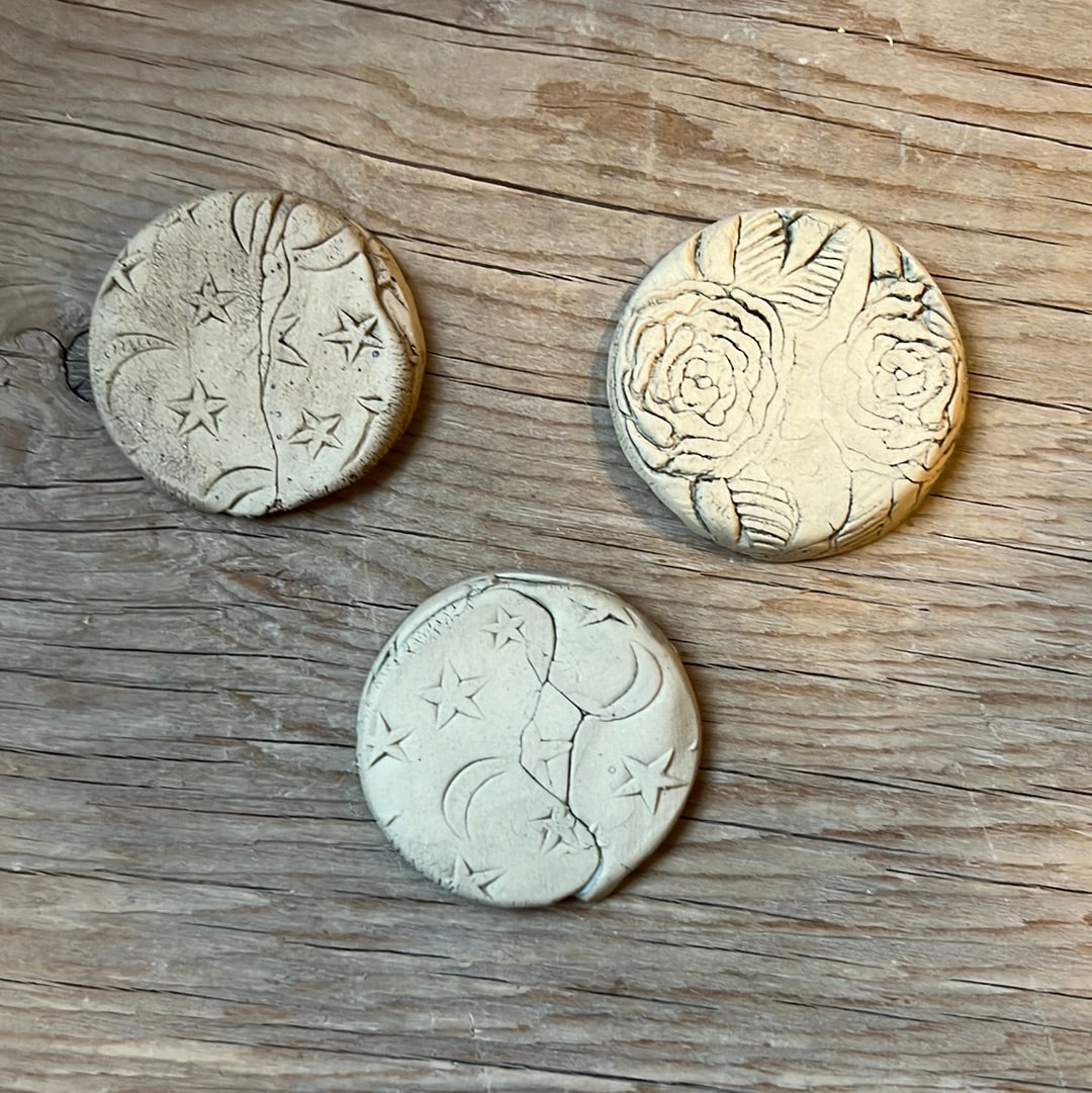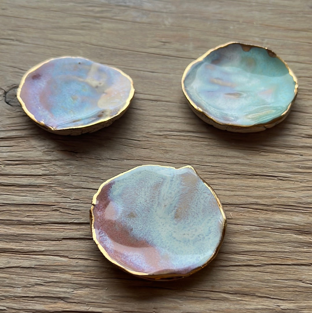 A flat trinket dish that can be used for jewellery.  This hand built ceramic dish is approximately 2” in diameter, gold lustre around the rim.  Each piece is made by hand; therefore, sizes and colours may vary slightly.