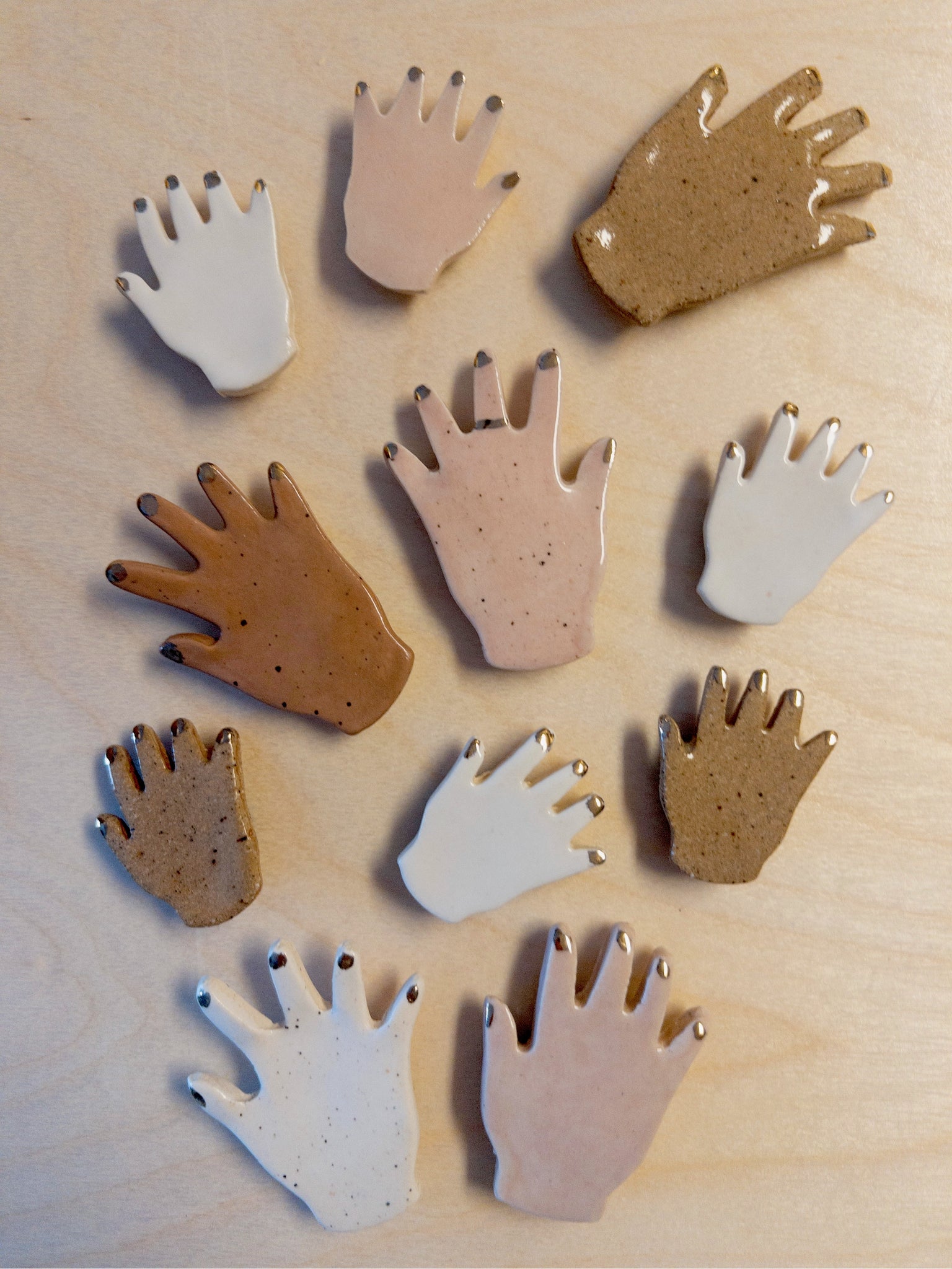 Ceramic hand magnets with gold lustre fingernails. The bigger hand measures approximately 1 1/4” wide and 2 1/4” tall and the tiny one measures 1” wide and 1 1/2” tall. Each piece is made by hand; therefore, sizes and colours may vary slightly.